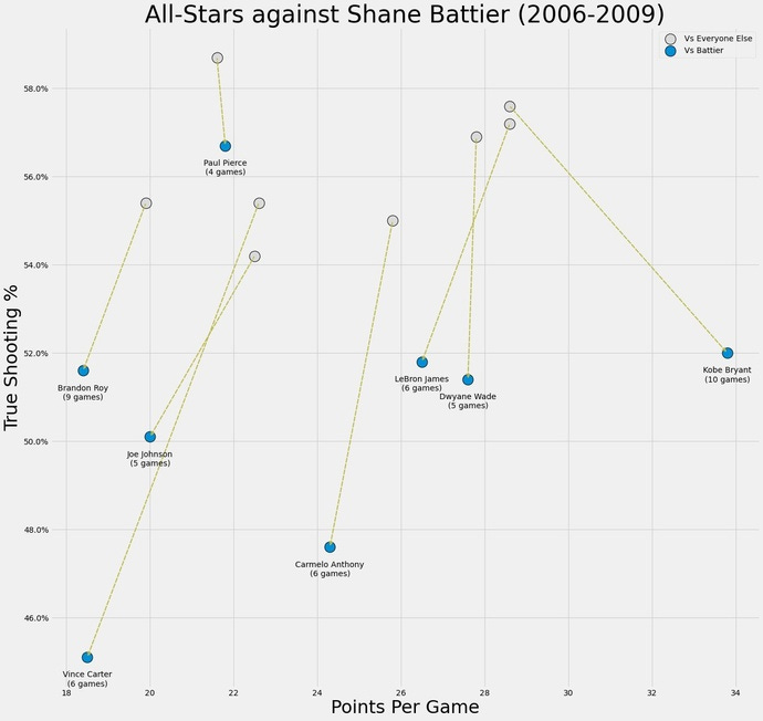 Battier is an interesting study to say the least. As Lewis details, his base physical measurements don’t stick out, and then on further game analysis, he’s not particularly quick. Of course, physical limitations do play a role on any team - despite Battier’s proficiency on defense, you would never stick him on Chris Paul or Dwight Howard. Night after night though, Battier guarded the best wing on every team with great success. Here is a visualization of the All-Star guards/forwards Battier consistently got a chance to match up against, from 2006-2009.