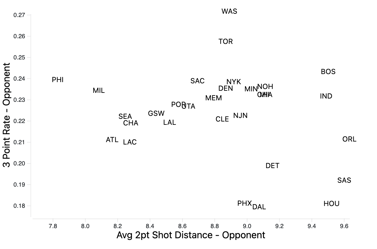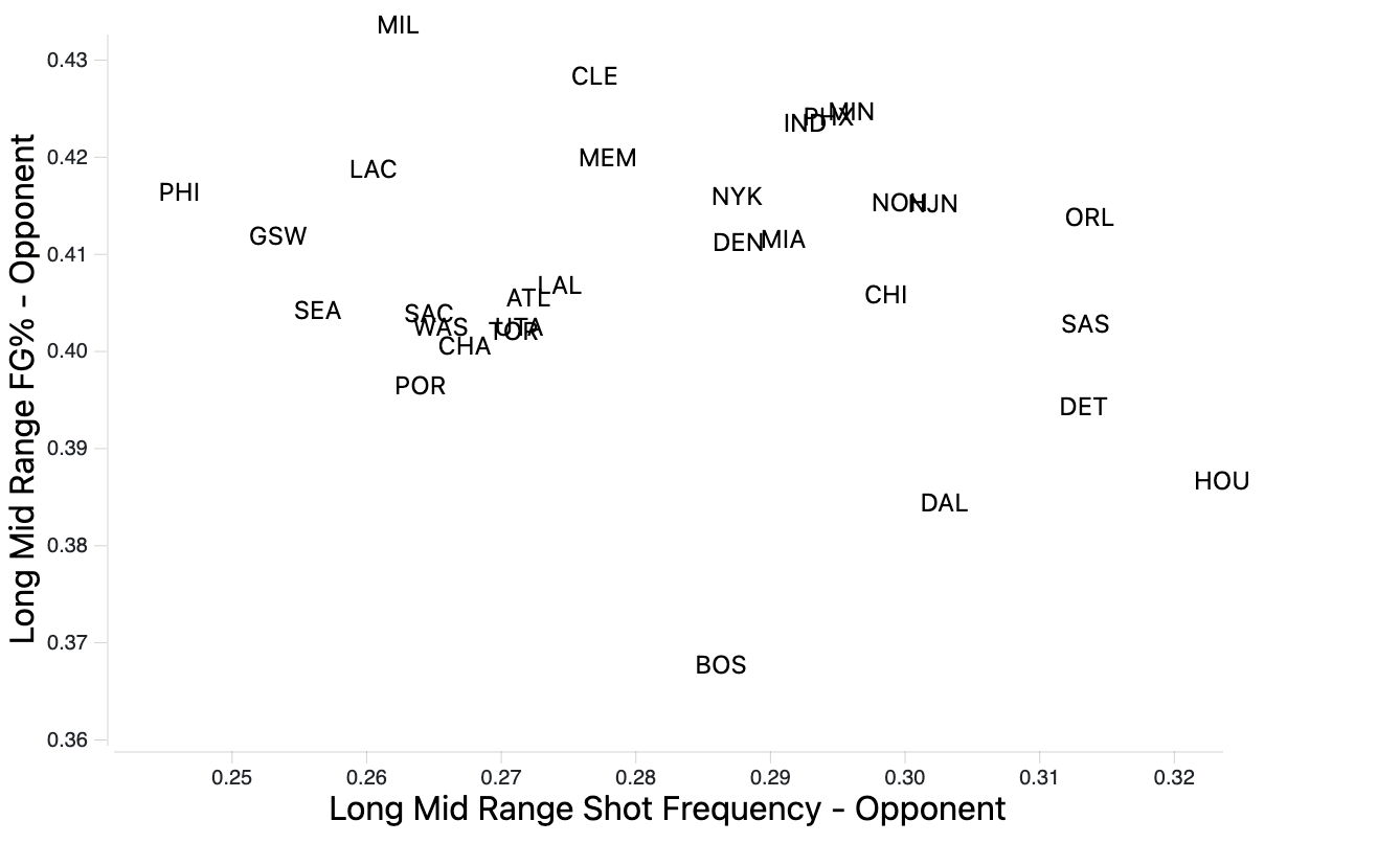 This visualization shows that those Rockets limited their opponents to low field goal percentages on their long twos, while also goading them into taking more than they did against any other team in the NBA.